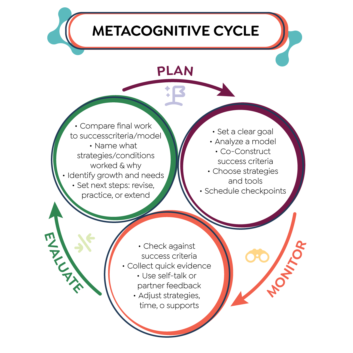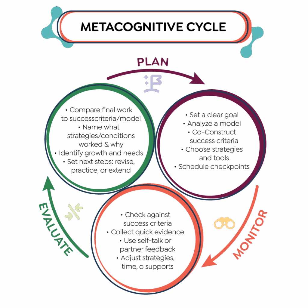 What makes the Metacognitive Cycle especially powerful is that it feeds itself. Each pass through the cycle builds greater clarity, confidence, and strategic awareness. Over time, learners internalize the process. Learners begin to plan with intention, monitor with purpose, and evaluate with insight across tasks, subjects, and contexts. Learning continues to move forward because learners know how to keep it in motion.